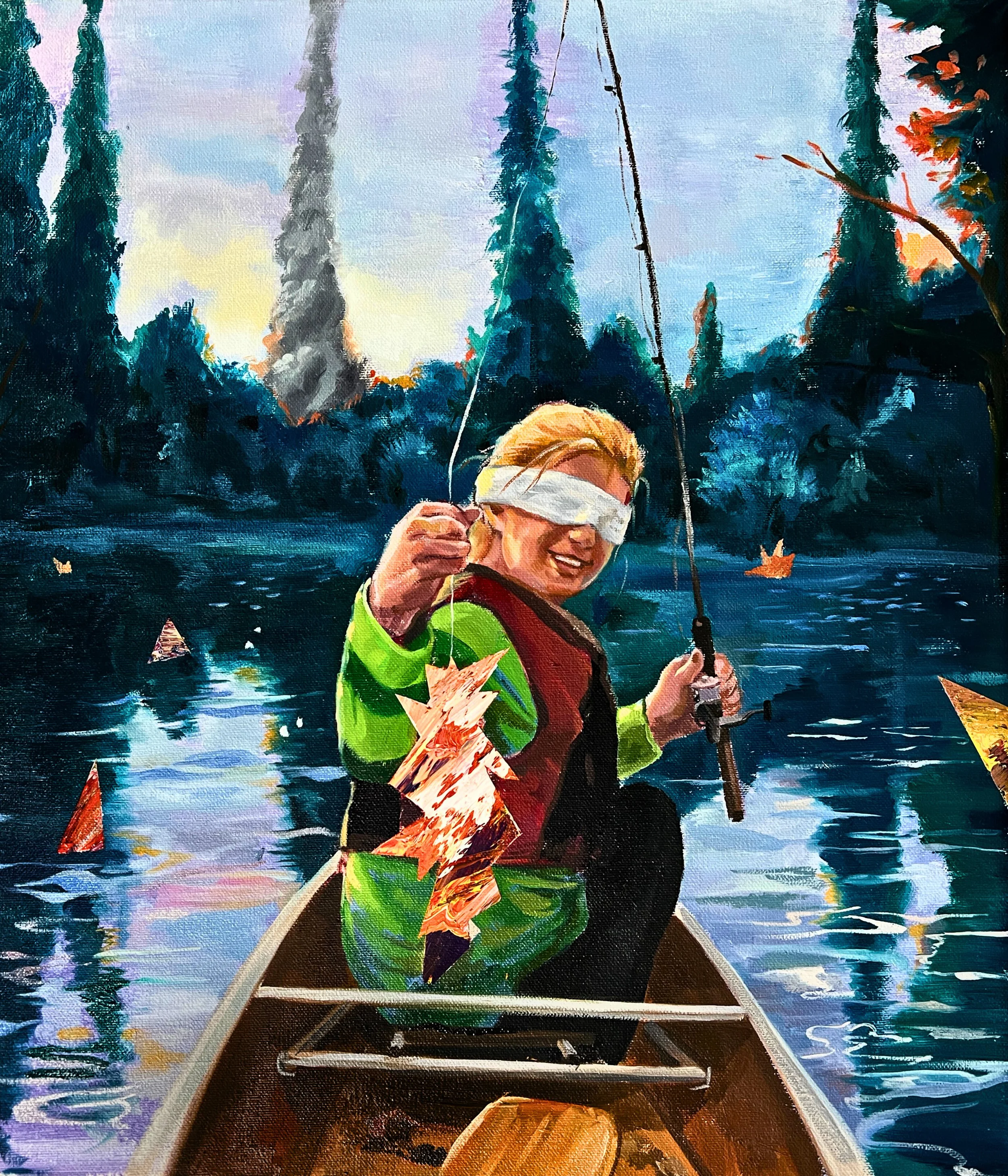 Additional Details | “Blind Angler” was inspired by the environmental controversy over the Seine River in Paris during the Olympics. For over a century, the response to pollution was not to clean the water, but to simply avoid it and abandon the river entirely. The figure sits fishing on a lake that looks calm, almost pretty at first glance. But with a closer look, the water is dead from pollution. This "willful blindness" here is how it's not that “we didn’t know,” but “we knew, and we decided not to know.” The red, sharp forms rising from the lake deliberately break the realism of the scene. They don’t belong in a peaceful landscape, and yet they do.